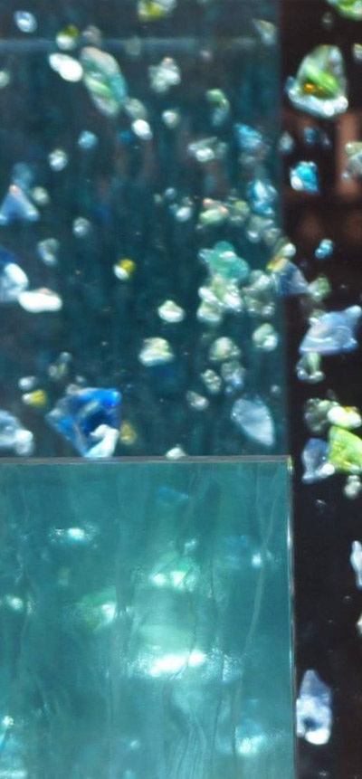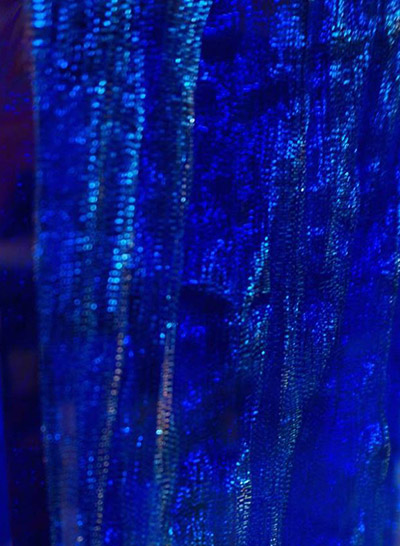 Rose chimique, orange solaire, bleu ethnique ou pourpre mystérieux issus de la gamme du Cfc ont ainsi pris forme et volume grâce à la mise en scène d’échantillons aux effets de matières, jeux de lumières, d’inclusions ou de gravures que permet le matériau.