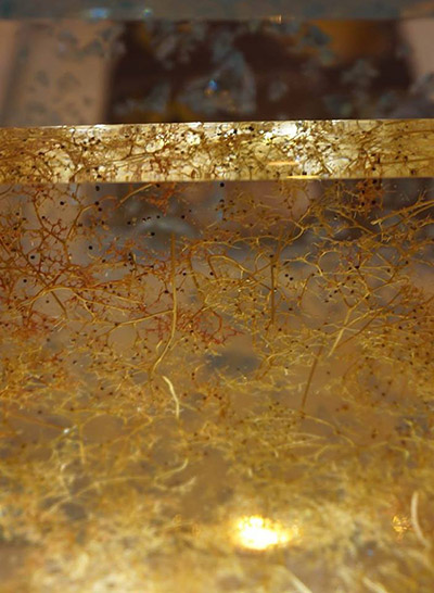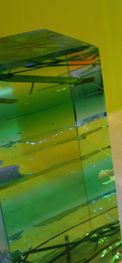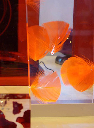 Rose chimique, orange solaire, bleu ethnique ou pourpre mystérieux issus de la gamme du Cfc ont ainsi pris forme et volume grâce à la mise en scène d’échantillons aux effets de matières, jeux de lumières, d’inclusions ou de gravures que permet le matériau.